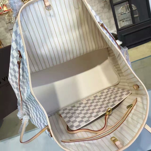 The Neverfull GM tote unites timeless design with heritage details. Crafted from fresh Damier Azur canvas with natural cowhide trim, it is ultra-roomy yet never bulky, with side laces that cinch for a sleek allure or loosen for a more casual look. Slim, comfortable handles slip easily over the shoulder or arm. Lined in colorful textile, it features a removable pouch which can serve as a clutch or an extra pocket.