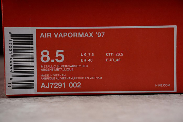 nike mens AIR VAPORMAX 97 "SILVER BULLET" metallic silver varsity red AJ7291-002
