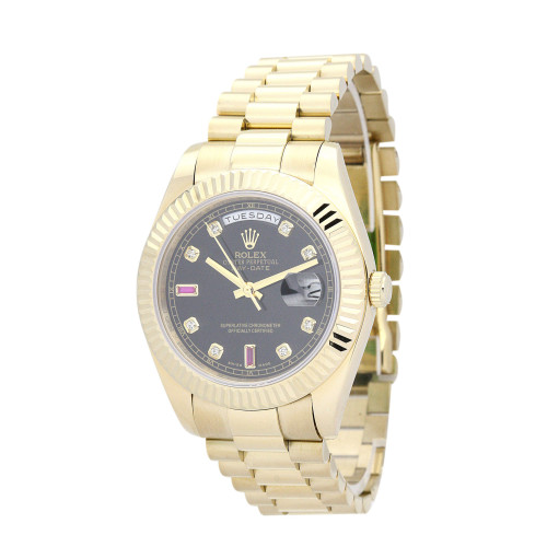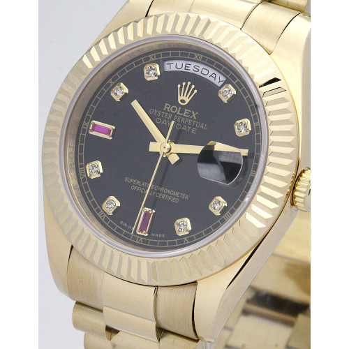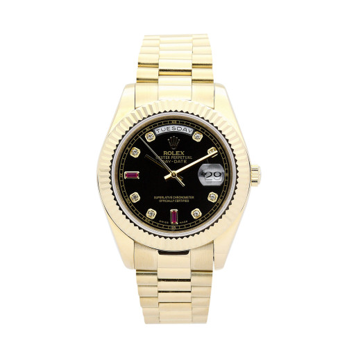 Additional information Product Range Day-Date model 118238 Brand Rolex Gender Men Model 118238 Movement Automatic Range Day-Date Water Resistant Water Resistance Bracelet Material Yellow Gold Plated Case Material Yellow Gold Plated Case size 36 MM Dial type Black Diamond Bracelet Material Steel