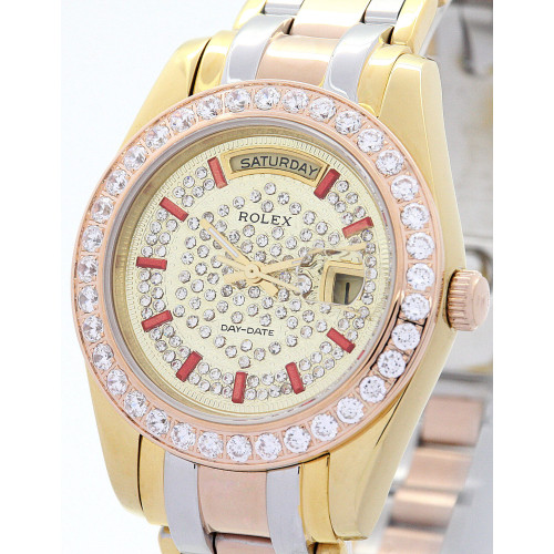 Additional information Product Range Day-Date Water Resistant Water Resistant model 118346 Bracelet Material Rose gold and Yellow gold and Steel Brand Rolex Case Material Rose gold and Yellow gold with Diamonds Case size 36 MM Dial type Yellow gold with Diamonds Gender Ladies Model 118346 Movement Automatic Range Day-Date Water Resistant Water Resistance Bracelet Material Steel