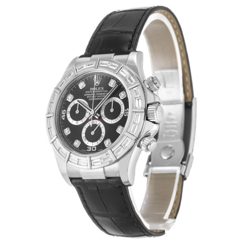 Additional information Product Range Daytona Water Resistant Water Resistant model 116589BR Bracelet Material Alligator – Black Brand Rolex Case Material White Gold set with Diamonds Case size 40 MM Dial type Black Diamond Gender Men Model 116589BR Movement Automatic Range Daytona Water Resistant Water Resistance Bracelet Material Leather