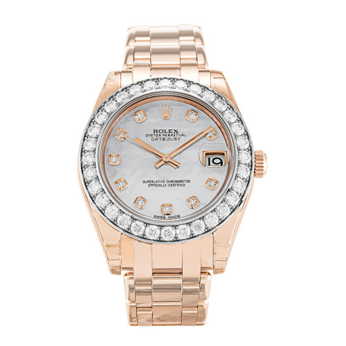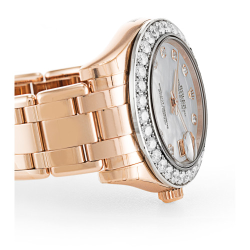 Additional information Product Range Pearlmaster Water Resistant Water Resistant model 81285 Bracelet Material Rose Gold Brand Rolex Case Material Rose Gold set with Diamonds Case size 34 MM Dial type Mother of Pearl – White Diamond Gender Ladies Model 81285 Movement Automatic Range Pearlmaster Water Resistant Water Resistance Bracelet Material Steel